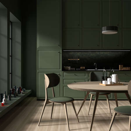 Cozy Modern kitchen room interior design with dark green wall.3d rendering