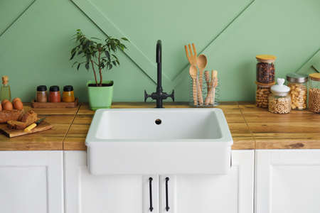 White sink with houseplant, food and kitchen utensils on counters near green wall