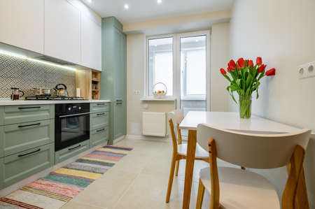 Interior of contemporary kitchen with minimalist style furniture and gas stove in light apartment