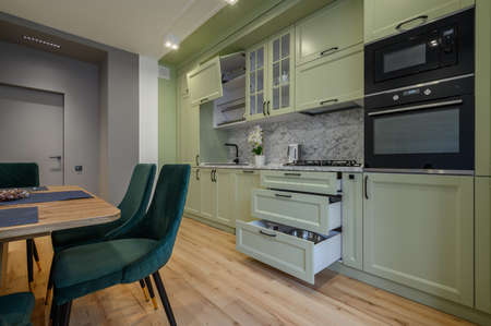 Cozy modern kitchen interior, some drawers pulled out