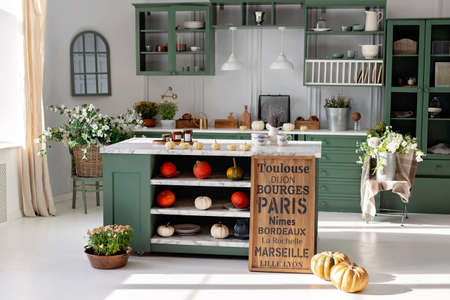 Kitchen with green vintage furniture, pendant lights, marble counter top with flowers and pumpkins, pots of autumn flowers, cupboard with various mugs, crockery and cutlery. Soft selective focus.