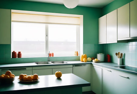 kitchen in modern house with green walls, white cupboards and oranges