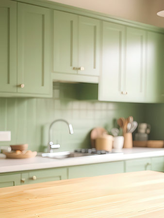 Kitchen interior with wooden table and green cabinets. Blurred background.