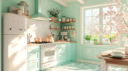 Green kitchen interior with furniture. Stylish cuisine with flowers in a vase. Wooden kitchen in spring decor. Cozy home decor. Generative AI illustration