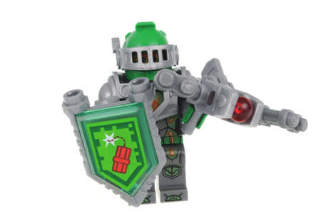Adelaide, Australia - July 8, 2016: An Aaron Fox Nexo Knights Lego Minifigure isolated on a white background. Lego is very popular with children and collectors worldwide.