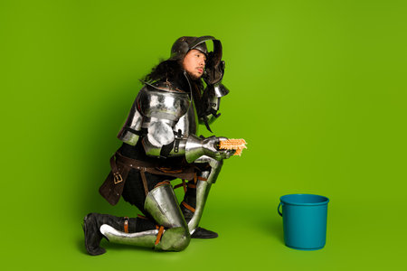 Medieval knight in armor with a blue bucket on green background symbolizing a humorous blend of historical and modern elements
