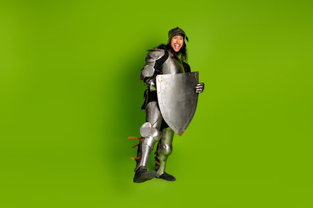 Young man in medieval knight armor posing with a shield on bright green background