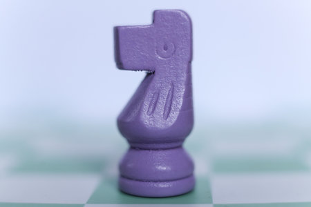 Macro photograph of a purple chess knight piece on a mint green and white chessboard. Minimalistic and creative concept