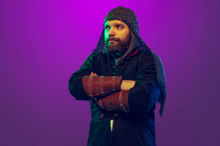 Dreams, thoughts. Young serious bearded man in image of medieval warrior, archery in chain armor isolated over purple background in neon. Comparison of eras