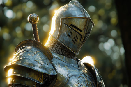 A knight in shining armor poses proudly in a wooded area, illuminated by warm sunset hues.