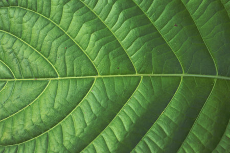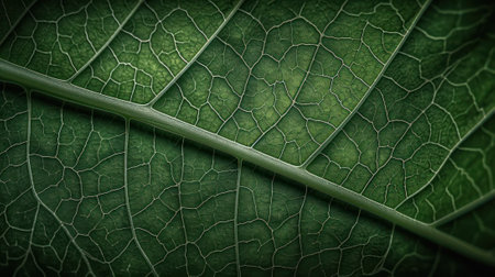 Close-up macro photography of detailed green leaf texture with visible veins. Showcasing the natural pattern and organic surface in a botanical background