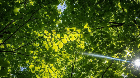 Dappled showing sunlight filters through a dense canopy of vibrant green leaves, creating dappled light patterns and a lens flare effect against the...