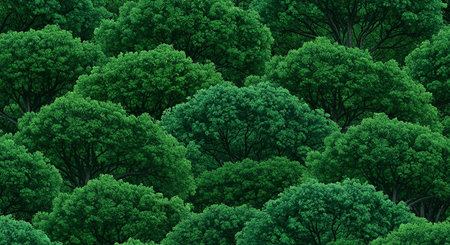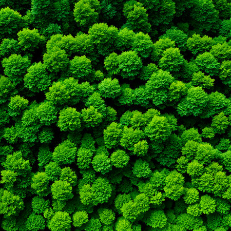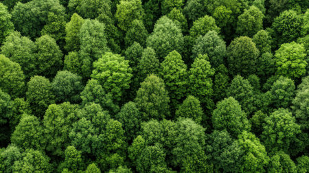 Stunning aerial perspective of vibrant treelines in a natural forest. The image captures the diverse shades of green foliage and dense vegetation canopy, promoting ecological beauty.