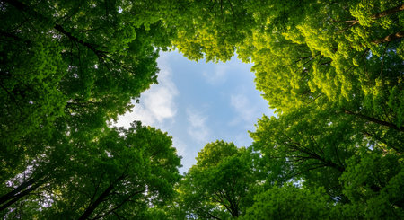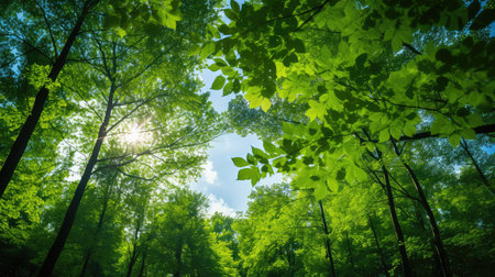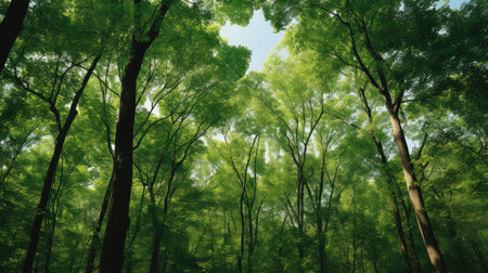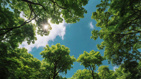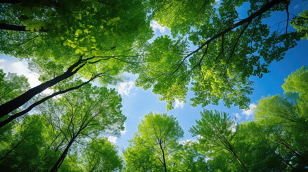 Looking up at the green tops of trees. An amazing and realistic illustration created by Artificial intelligence.
