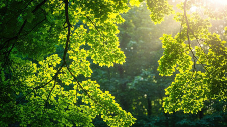 Fresh green deciduous trees framed by leaves, with the sun casting its warm rays through the foliage. Scenic forest background.