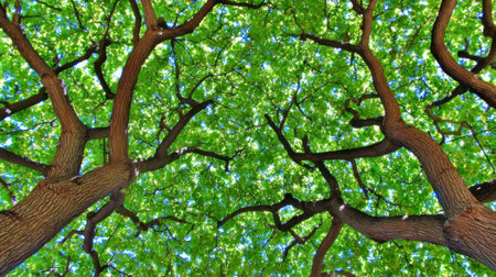 From below, the view upwards reveals strong branches and dense foliage of a healthy tree. The green leaves create a beautiful, textured ceiling of nature.