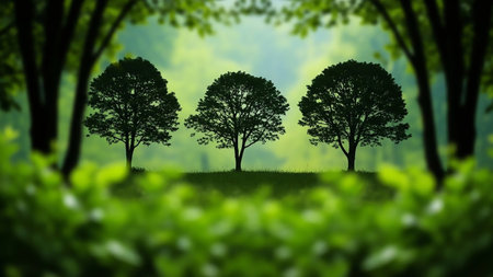 Depth showing three silhouetted evergreen trees standing tall on a grassy knoll with a softly blurred green forest canopy and foreground foliage framing the scene...