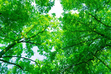 looking up in the green forest towards sunlight in spring. High quality photo