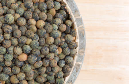 lentils vegetarian food. lentils in a wooden spoon. view from above. close up.