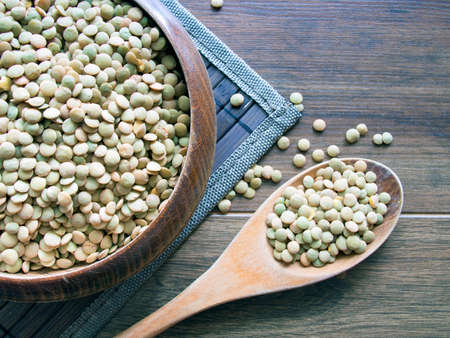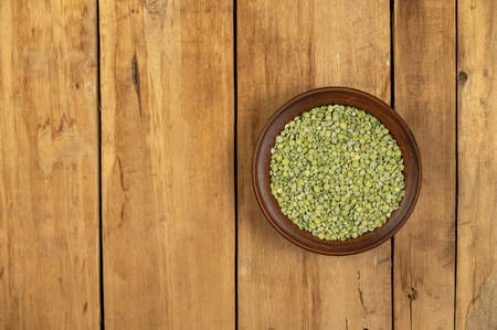 Dry split peas in a bowl against a wooden background. Green pea beans in brown earthenware bowl. Uncooked food. Health food. top view. Copy space for text and design elements.