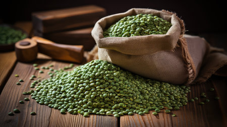 A rustic kitchen scene with a burlap sack of green lentils, highlighting their natural texture and color.