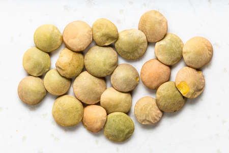 Top view of green split peas isolated on white. Concept of vegan nutrition, cooking basics, and organic produce. Top view. Textured background.