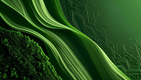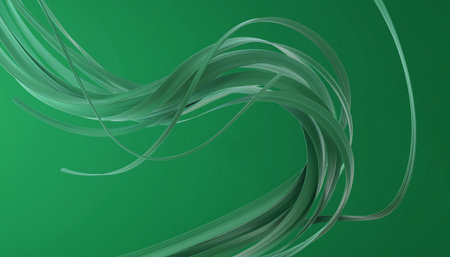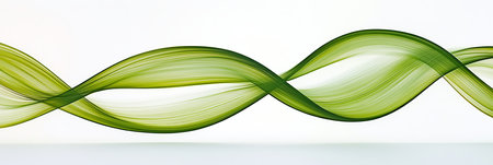 An abstract artwork features flowing green lines against a gradient background. The composition shows dynamic wave-like forms, with transparent and overlapping elements. The illustration uses shades of green and white, ideal for various design projects, web design, or editorial use. The image presents a clean and modern aesthetic.