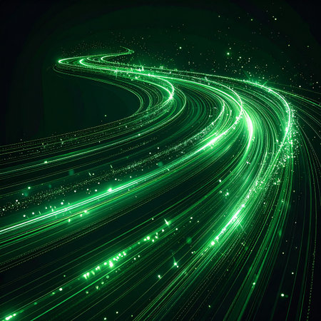 Abstract Green Particles Swirling Effect With Light Trails On Dark Background, Technology Background