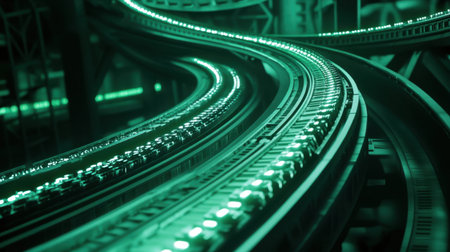 A close-up view of futuristic green train tracks illuminated with neon lights, showcasing an advanced industrial environment and dynamic design.