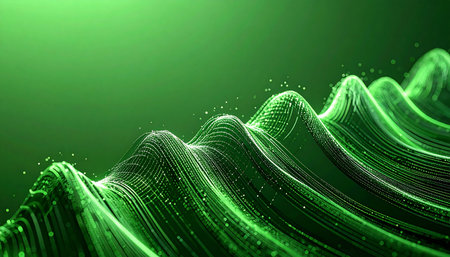A vibrant green digital landscape undulates with waves of flowing data particles. This abstract visualization represents the complex streams of information, big data analytics, and the dynamic energy of future technology and innovation.