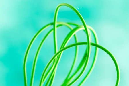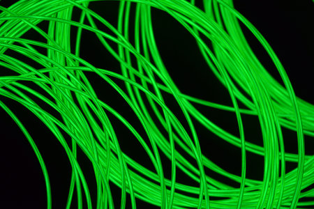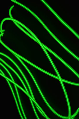 Green neon wire on a black background. Shallow depth of field. Beautiful thin glowing green, lime wires, beaten cable chaotically twisted on a black plastic background.