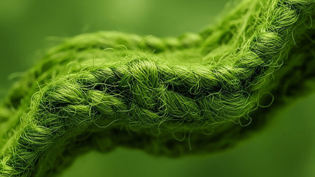 Thick showing extreme close-up macro shot of a thick vibrant green braided rope made of natural fibers showcasing intricate texture and detail keywords: green rope,...