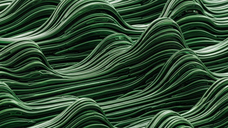 An abstract pattern of smooth, glossy dark green waves flowing and undulating, creating a visually dynamic and...