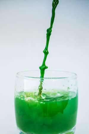 Green paint is poured into a transparent glass with clear water in the movement and paints clear water green on a white background.