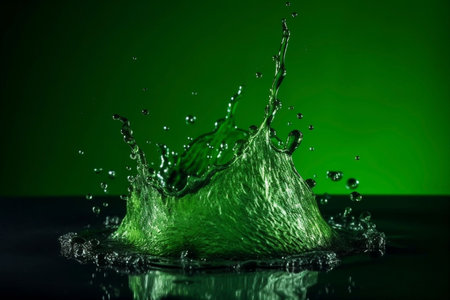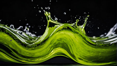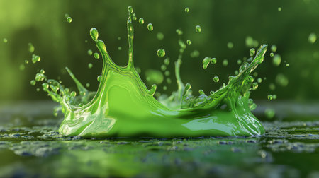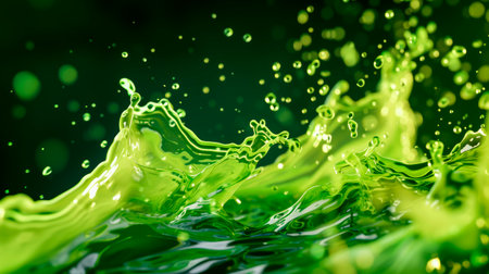 A dynamic and vibrant green liquid splashes in water, creating intricate patterns and droplets captured in sharp detail.