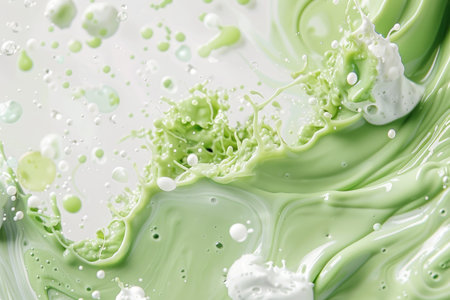 Dynamic macro photo of fresh matcha milk splash with white and green drops in motion, creative food background