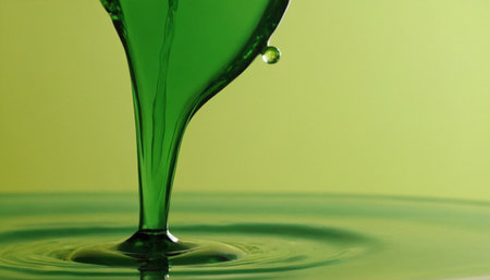 A lively burst of emerald-green liquid captures fluid motion with graceful curves and shimmering droplets, set against a gentle gradient backdrop symbolizing vitality and