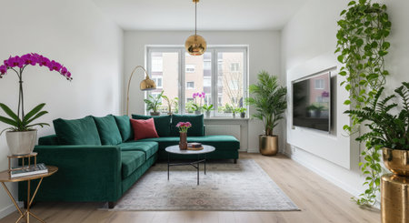The image showcases a modern and minimalist living room design with a green sofa, artwork, plants, and natural light, suitable for advertising or home decor editorials.