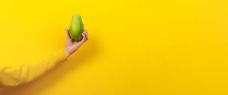 woman hand holding green papaya on yellow background, healthy food concept, panoramic image with space for text.