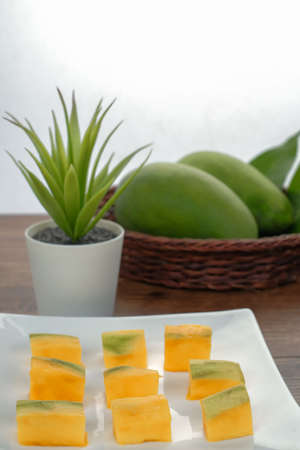 Ripe mango fruit in the basket on wooden table with blurred green background, selective focus