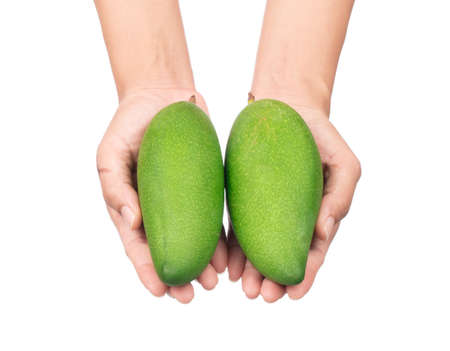 Fresh green mango (Bunbandan mango), hold by female hands.