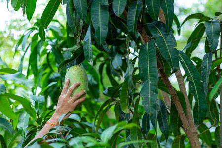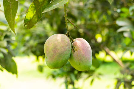 Green mango fruit on tree with tropical farm background in Thailand. Agriculture industry concept at harvest in summer.