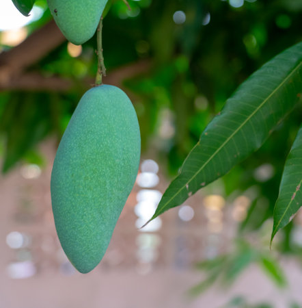 Green unripe mango on the tree with blue sky background. Green mango can be sour or nutty and sweet depending on the variety.
