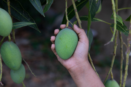 closeup the ripe green mango fruit with branch with leaves hold hand over out of focus green brown background.