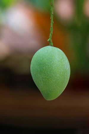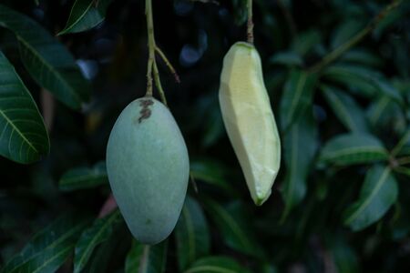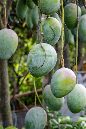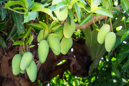 Close up of growing Mangos Hanging on Mango Tree, Mangifera indica. Fresh Fruits on the tree.
