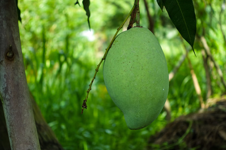 raw mango hanging on tree with leaf background in summer fruit garden orchard / green mango tree