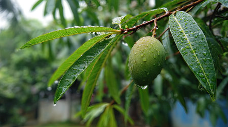 A close-up shot captures a green mango suspended from a branch, highlighted against blurred foliage. The leaves display raindrops, suggesting a recent rain. The scene features natural lighting and a shallow depth of field, suitable for depicting elements of nature, agriculture, and providing copy space for various commercial applications.