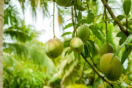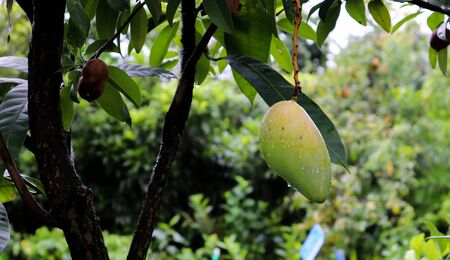 Fresh mango fruit Mangifera indica hangs from a tree in tropical Naples, Florida