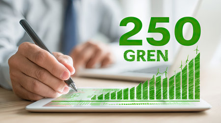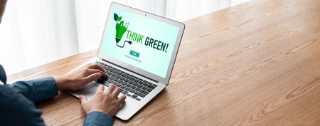 Green business transformation for environment saving and ESG business concept. Businessman using tablet to set corporate goal toward environmental friendly management and alternative clean energy use.