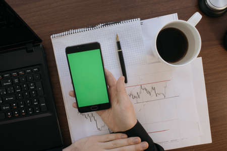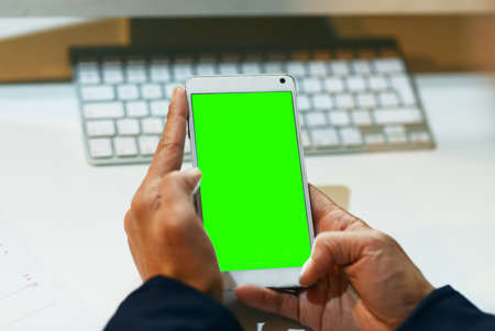 hand of man holding mobile smart phone with chroma key green screen on gren background